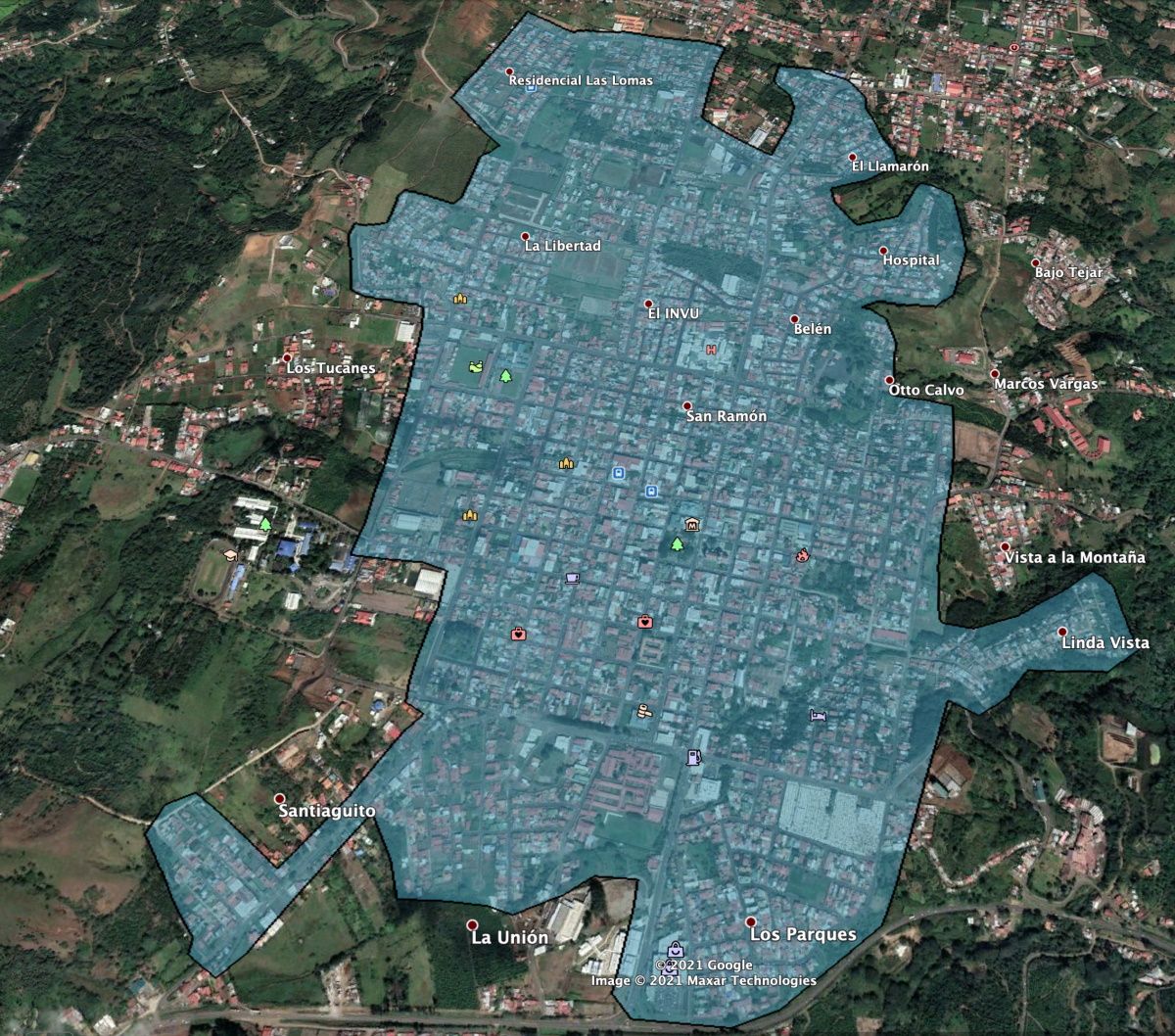Delegación San Juan - Polideportivo - Los Jardines - Calle Imas - Caritas - Los Cipreses - Hogar de Ancianos - Barrio Belén - Invu - MaxiPali - Hospital